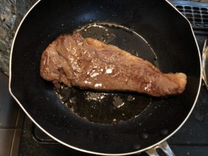 調べた結果、まず生肉の状態でオリーブオイルを塗し、そのまま常温でフライパンに置いてから火をつけ強火で表面だけ焼く…