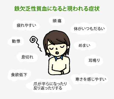 全身に酸素が上手く運ばれず、頭痛やだるさ、めまいなどの症状がでます。
