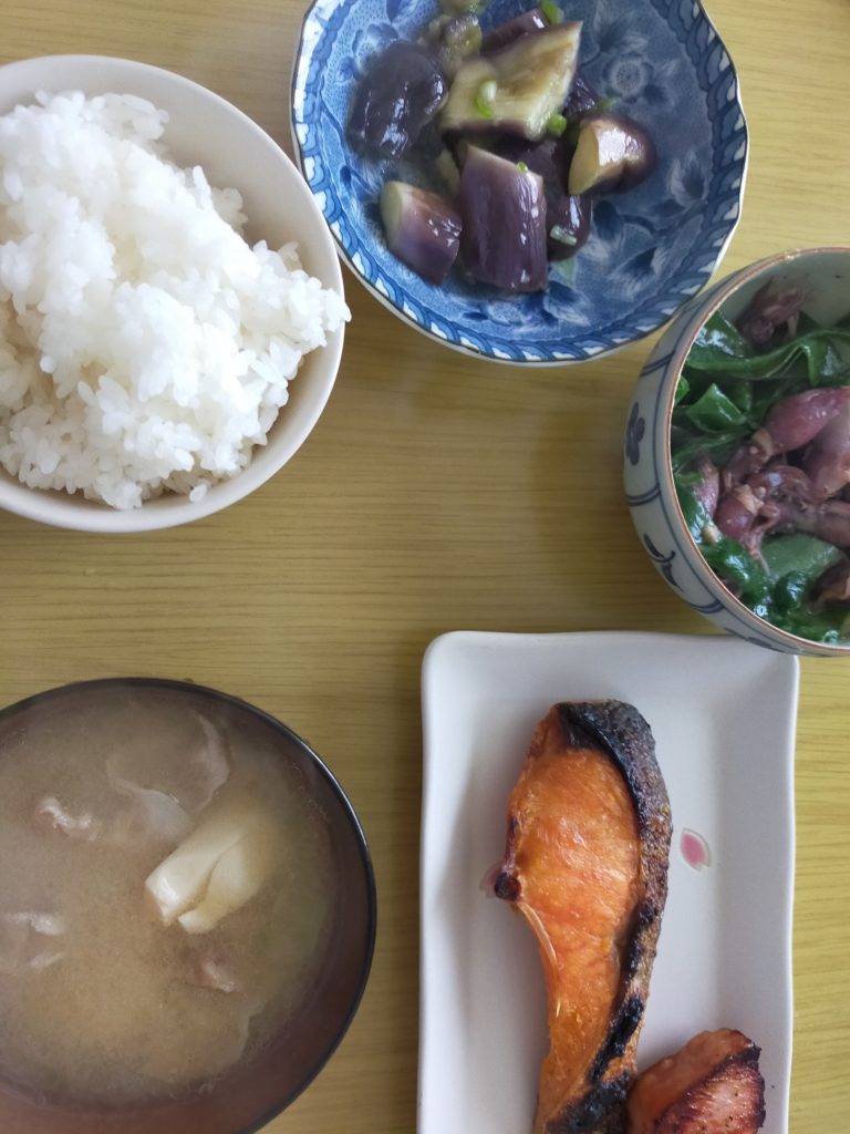 ホタルイカとネギの酢味噌あえ、ナスのおひたし、豚汁に鮭