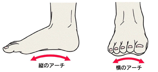 健常な足には縦のアーチだけでなく横のアーチがあります。外反母趾ではこれらのアーチが崩れて扁平足になると、中ほどにある母指の中足骨が扇状に内側に開き、それから先の指は逆に靴で外側に圧迫されておこります。