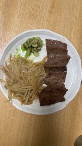 もやしはカルビを焼いて残した油を使って、炒めました、上の緑のはニンニクです。