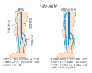 原因は、静脈弁の機能が低下し逆流する血液
