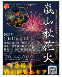 来月の10月11日と12日は毎年恒例になりつつある嵐山の秋花火です。